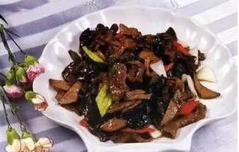 制法:黑木耳泡發(fā)洗凈撕朵。豬肝洗凈切薄片,在水淀粉中抓芡均勻,在熱水中焯一下。將豬肝下入八成熱的油鍋中,加料酒,蔥末,姜絲,精鹽煸炒至熟,倒出。鍋留底油,用旺火將木耳炒至亮滑透香,倒回豬肝,加味精,香油炒勻即成。