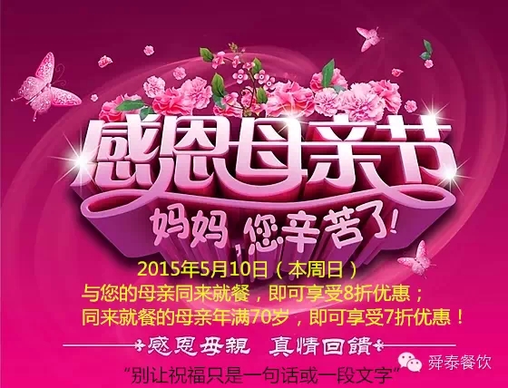 時光易老,紅顏不再,無論我們身在何方,請記得那個惟愿你好,用生命孕育你美好的那個女人!這個母親節(jié),舜泰餐飲公司全體員工與您一起把最美好的祝福送給天下所有的母親:母親節(jié)快樂!