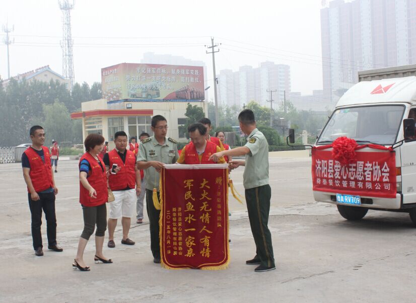 2015年八一建軍節(jié)來臨之際,濟(jì)南舜泰餐飲管理有限公司攜手濟(jì)陽縣愛心志愿者協(xié)會(huì)為濟(jì)陽消防大隊(duì)官兵送去錦旗和愛心物資。